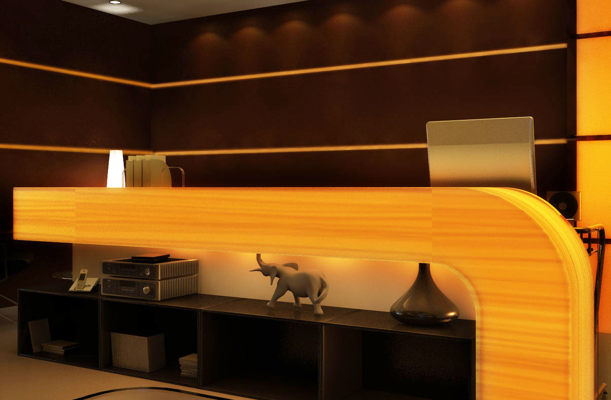 For Impact Lighting Inc., light transmission does not mean a wood surface that illuminates like a lamp. Basically, with LED technology the backlit panel gives aan innovative presence to the veneered surface by highlighting the natural characteristic on the front surface of the veneers.