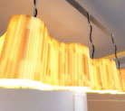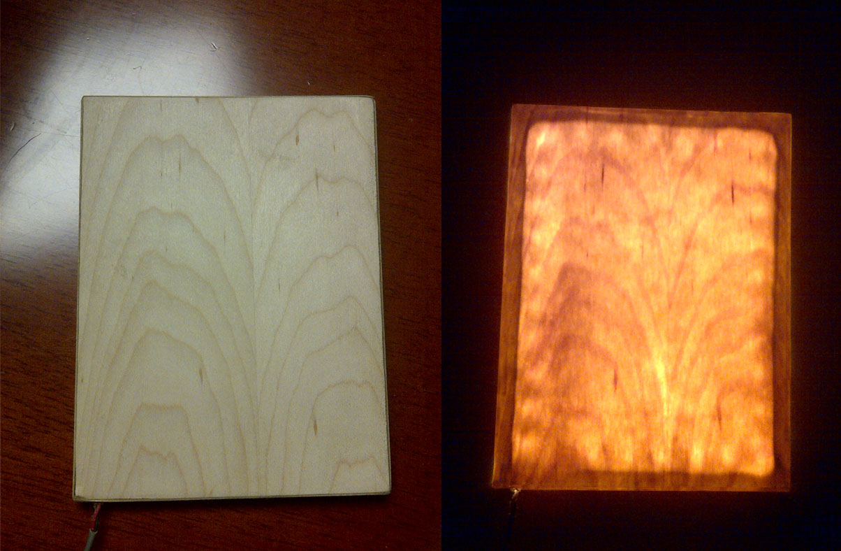 The light transmission of the material is even, on the whole surface of the panel. When lit the veneer structure creates beautiful and natural patterns on the surface. The light transmitting veneered material is suggested to be used indoors.